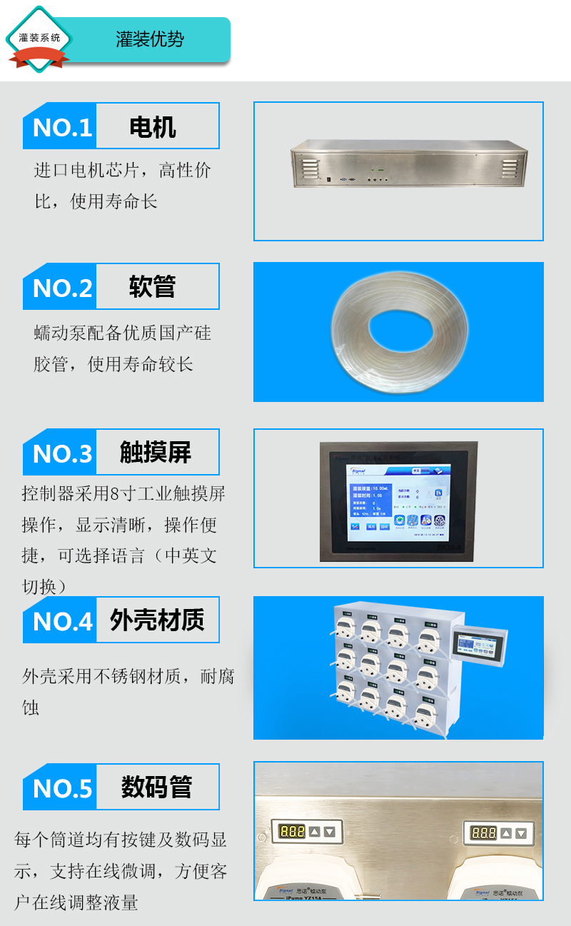 1.灌裝系統(tǒng)由5組基本通道,通道數(shù)量可定制(可擴(kuò)展至32通道),一臺控制器組成,可安裝YZ15、YZ25泵頭