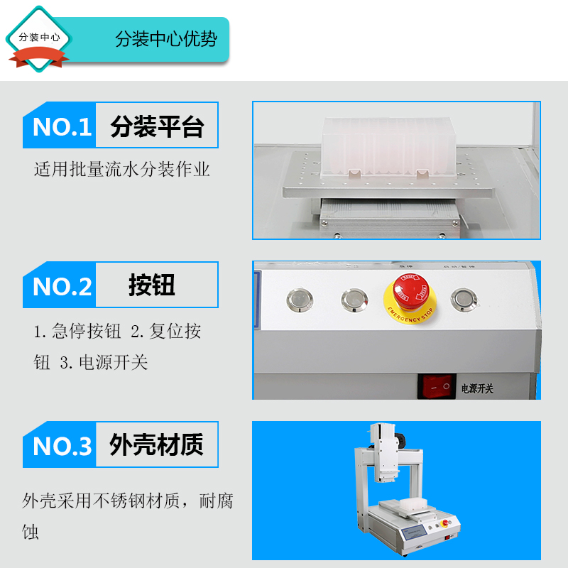 ? ? ?1.桌面型設計,占用空間小,適用于批量流水分裝作業 ? ? ?2.轉速高達300mm/s,高耐久性 ? ? ?3.重復精度:±0.02mm-0.05mm ? ? ?4.可存儲999個工藝文件 ? ? ?5.執行單元:分配型蠕動泵或灌裝系統 ? ? ?6.可實現32通道分裝
