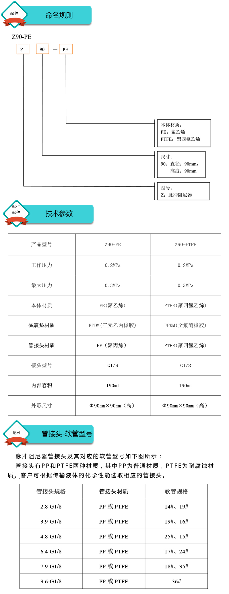 Z90-PE(聚乙烯)Z90-PTFE(聚四氟乙烯)兩種型號,客戶可根據(jù)傳輸液體的化學性能選取相應(yīng)型號的脈沖