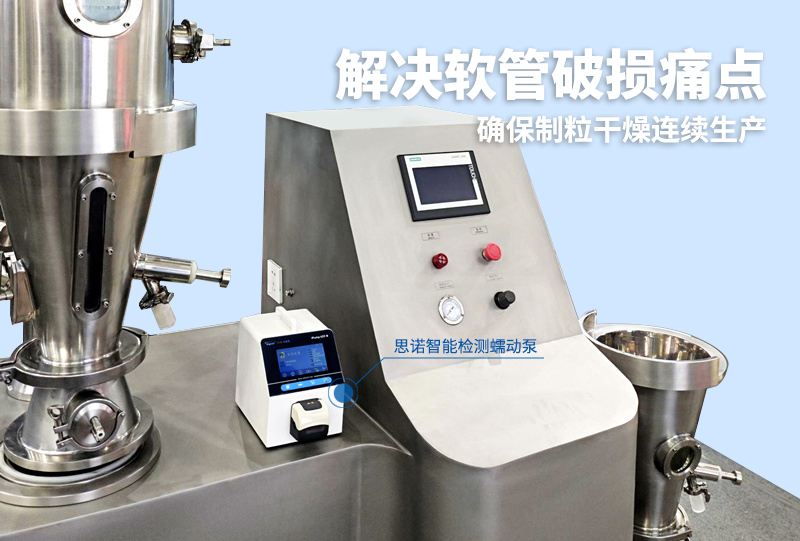 在固體制劑生產中,制粒干燥機需要通過蠕動泵將粘合劑等液體物料提升至一定高度(即具備足夠的蠕動泵揚程),穩(wěn)定輸送到混合制粒腔內。這一過程對蠕動泵的性能提出了雙重挑戰(zhàn):它既需要克服垂直管道帶來的阻力與壓力,保證流量的穩(wěn)定;又不能因軟管長期承壓運行而破損導致的泄漏風險。一旦在高揚程工況下發(fā)生泄漏,液體不僅浪費,更可能自上而下灑落,對下方設備造成廣泛的污染與電氣安全隱患。