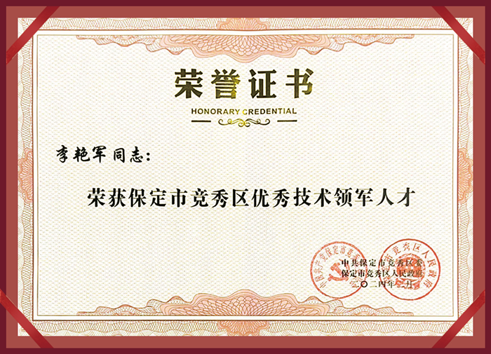 同時,李艷軍先生也榮獲“保定市競秀區(qū)優(yōu)秀技術(shù)領(lǐng)軍人才”榮譽稱號,并上臺領(lǐng)取了證書。這個榮譽是對他過去辛勤工作和取得成績的肯定,也是對他未來發(fā)展的鼓勵。他表示,這個榮譽將激勵他更加努力,在公司的發(fā)展中更加積極地貢獻自己的力量,為競秀區(qū)經(jīng)濟的進一步發(fā)展作出更大的貢獻,并由衷的感謝區(qū)領(lǐng)導(dǎo)的嘉獎和認可,并表示衷心感激!